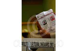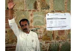 SAN JUAN BAUTISTA GUELACHE, OAXACA 17AGOSTO2008.-En un ambiente tenso y con resguardo de policías municipales, las elecciones para presidente municipal de dicha comunidad concluyeron esta tarde, donde el ganador de la planilla verde Gildardo Pérez González con 61 votos a favor se reunió con su cabildo así como pobladores en la plaza municipal para celebrar el triunfo FOTO: MAX NÚÑEZ/CUARTOSCURO.COM