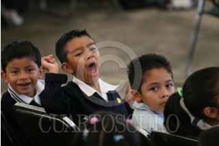 MÉXICO D.F., 18AGOSTO2008.-El presidente Felipe Calderón, puso en marcha el nuevo ciclo escolar 2008-2009 y durante la ceremonia fue felicitado en publico por su cumpleaños 46 por parte de Elba Esther Gordillo, dirigente del SNTE y por Josefina Vázquez Mota, titular de la SEP. En la iamgen un niño bosteza durante la ceremonia. FOTO: GUILLERMO PEREA/CUARTOSCURO.COM