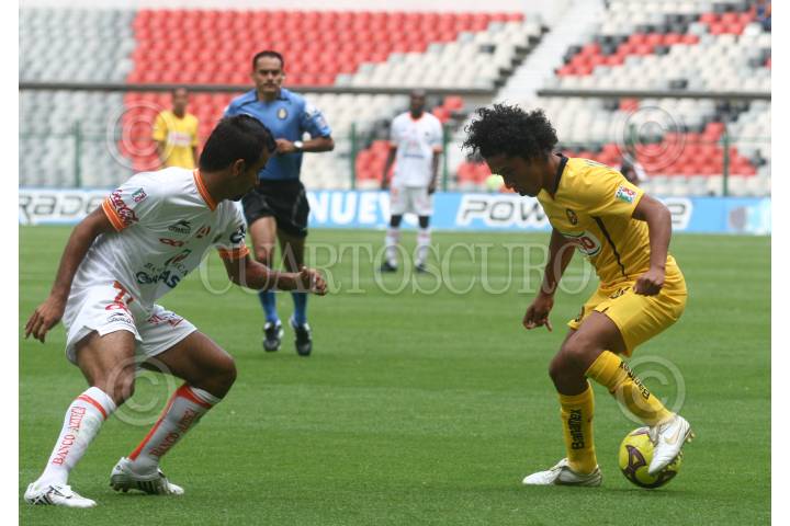 MÉXICO, D.F., 24AGOSTO2008.- Los Jaguares de Chiapas derrotaron 3-2 a las Águilas del América, en el Estadio Azteca, en el cierre de la jornada 5 del torneo de apertura 2008. En la imágen: Alfredo Moreno pelea el balon tras Daniel Hernández. FOTO: SÁSHENKA GUTIÉRREZ/CUARTOSCURO.COM