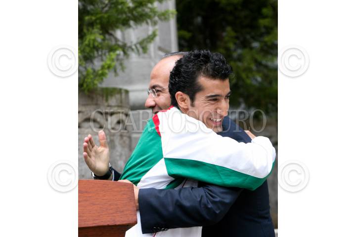 MÉXICO, D.F., 29AGOSTO2008.- Ma Jin, entrenadora, Tatiana Ortiz, Paola Espinoza, Guillermo Pérez, Felipe Calderón Hinojosa, Presidente de México, María Espinoza, José Luis Onofre y Carlos Hermosillo, director de la CONADE, durante la visita oficial de los medallistas olímpicos ganadores en Beijing China. FOTO: MOISÉS PABLO/CUARTOSCURO.COM,