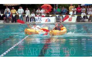 El ex futbolista Miguel Herrera y el velocista Alejandro Cárdenas compiten en la disciplina de kayak, durante el evento para encontrar al atleta del año 2001. FOTO:Pedro Mera/CUARTOSCURO.COM