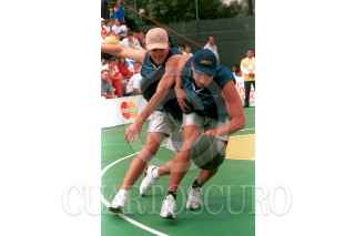 El futbolista Carlos Hermosillo y el velocista Alejandro Cárdenas compiten en la disciplina de basquetbol, en el marco del evento "Super estrellas" FOTO:Pedro Mera/CUARTOSCURO.COM