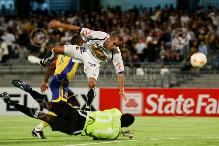 MÉXICO, D.F., 04SEPTIEMBRE2008.- David Toledo de los Pumas de la UNAM es perseguido por Mitchily Waul del Harbour View, en el partido eliminatorio de la Copa de Campeones de la Concacaf, disputado en el estadio de Ciudad Universitaria, el cual se encuentra empatado a cero tantos al medio tiempo. FOTO: ISAAC ESQUIVEL/CUARTOSCURO.COM