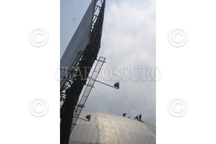NAUCALPAN, ESTADO DE MEXICO, 05SEPTIEMBRE2008.- Decenas de Trabajadores comenzaron el desmantelamiento del Toreo de Cuatro Caminos, construccion colosal que se encuentra entre los limites del estado de Mexico y el Distrito Federal. El espacio servira para un centro Comercial que se construira en el lugar. FOTO: ENRIQUE ORDOÑEZ/CUARTOSCURO.COM