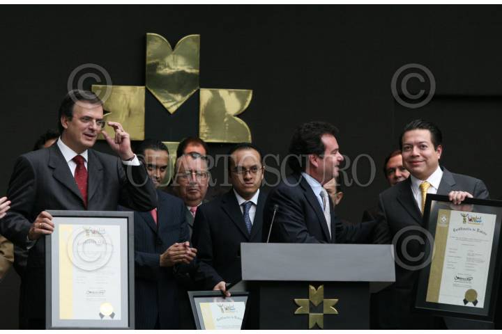 MÉXICO, D.F., 10SEPTIEMBRE008.- Marcelo Ebrard Casaubón, Jefe de Gobierno, Guillermo Prieto Treviño, presidente de la Bolsa Mexicana de Valores y Mario Delgado, Secretario de Finanzas del DF, durante la ceremonia de arranque de los fondos de inversión "Ciudad DF" que se realizó en la sede de BMV. FOTO: MOISÉS PABLO/CUARTOSCURO.COM