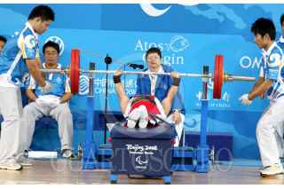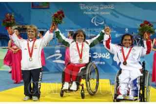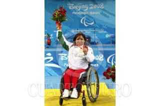 BEIJING, CHINA, 11SEPTIEMBRE2008.- Amalia Pérez Vázquez (Centro), atleta Paralímpica gano medalla de oro en el levantamiento de pesas (Powerlifting), al levantar 128 kilos en su categoría de 52 kilogramos, para imponer nuevo record paralímpico. En la imagen la competidora mexicana durante la premiación. FOTO:IMSS/CUARTOSCURO.COM
