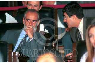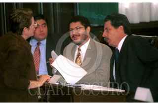 Los líderes parlamentarios, Martí Batres y Jesús Ortega, platican con su bancada durante la sesión donde se abordó la aprobación íntegra de la ley Cocopa para el próximo periodo de sesiones. FOTO: Pedro Mera/CUARTOSCURO.COM