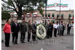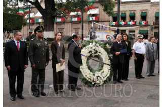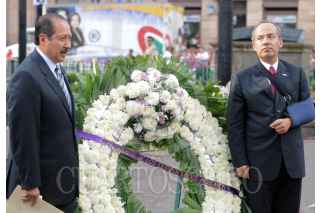 MORELIA, MICHOACÁN, 17SEPTIEMBRE2008.- Leonel Godoy, gobernador del estado y Felipe Calderón Hinojosa, Presidente de México, colocaron una ofrenda floral en la plaza Melchor Ocampo, lugar en la que sucedio el estallido del pasado 15 de Septiembre. FOTO: CUARTOSCURO.COM