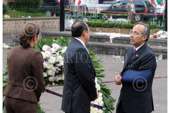 MORELIA, MICHOACÁN, 17SEPTIEMBRE2008.- Leonel Godoy, gobernador del estado y Felipe Calderón Hinojosa, Presidente de México, colocaron una ofrenda floral en la plaza Melchor Ocampo, lugar en la que sucedio el estallido del pasado 15 de Septiembre. FOTO: CUARTOSCURO.COM
