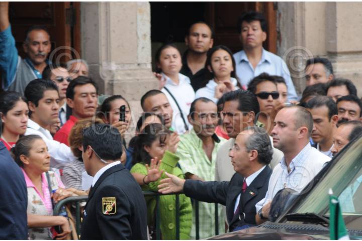 MORELIA, MICHOACÁN, 17SEPTIEMBRE2008.- Leonel Godoy, gobernador del estado y Felipe Calderón Hinojosa, Presidente de México, colocaron una ofrenda floral en la plaza Melchor Ocampo, lugar en la que sucedio el estallido del pasado 15 de Septiembre. FOTO: CUARTOSCURO.COM