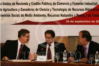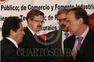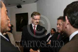 MÉXICO D.F., 24SEPTMEBRE2008.-Juan Carlos Romero Hiks, titular de CONACYT, acudió está tarde a las instalaciones del Senado de la República, donde compareció ante las comisiones unidas del Senado de la República. En la imagen, dialoga con el senador José Isabel Reyes. FOTO: GUILLERMO PEREA/CUARTOSCURO.COM