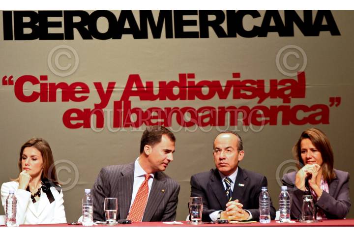 MÉXICO D.F., 01OCTUBRE2008.- Los Príncipes de Asturias, Felipe de Borbón y Grecia Letizia Ortiz al lado del presidente Felipe Calderón quien es acompañado de su esposa Margarita Zavala al termino de la inauguración del Primer Congreso de la Cultura Iberoamericana que se realiza en el Centro Nacional de las Artes. FOTO: RODOLFO ANGULO/CUARTOSCURO.COM