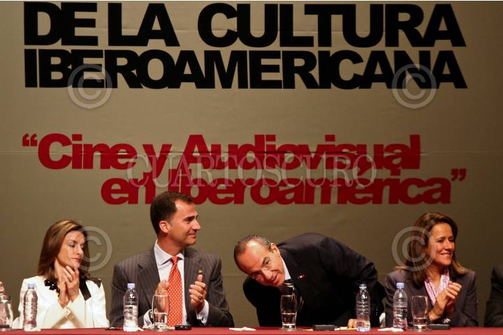 MÉXICO D.F., 01OCTUBRE2008.- Los Príncipes de Asturias, Felipe de Borbón y Grecia Letizia Ortiz al lado del presidente Felipe Calderón quien es acompañado de su esposa Margarita Zavala al termino de la inauguración del Primer Congreso de la Cultura Iberoamericana que se realiza en el Centro Nacional de las Artes. FOTO: RODOLFO ANGULO/CUARTOSCURO.COM