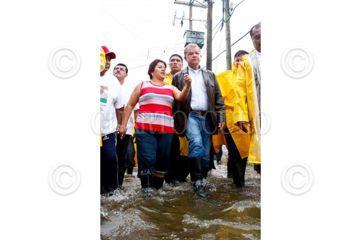 MINATITLAN, VERACRUZ., 01OCTUBRE2008.- La mayoria de las calles del centro de Minatitlan se encuentra inundadas debido a la creciente del rio Coatzacoalcos, autoridades estatales informaron que son las peores inundaciones de las que se tiene registro en los últimos 90 años. En la imagen elementos del Ejercito y la Marina ayudan a personas a llegar a sus casas que se encuentran incomunicadas debido a que tramos carreteros se encuentranb bajo el agua. FOTO: SAÚL LÓPEZ/CUARTOSCURO.COM