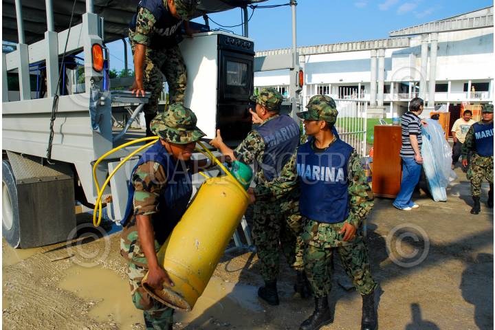 MINATITLAN, VERACRUZ., 01OCTUBRE2008.- La mayoria de las calles del centro de Minatitlan se encuentra inundadas debido a la creciente del rio Coatzacoalcos, autoridades estatales informaron que son las peores inundaciones de las que se tiene registro en los últimos 90 años. En la imagen elementos del Ejercito y la Marina ayudan a personas a llegar a sus casas que se encuentran incomunicadas debido a que tramos carreteros se encuentranb bajo el agua. FOTO: SAÚL LÓPEZ/CUARTOSCURO.COM