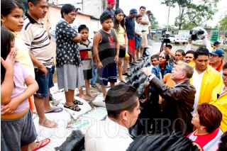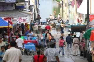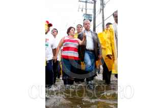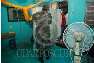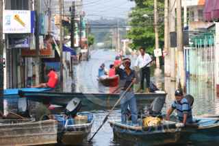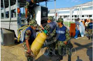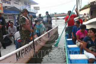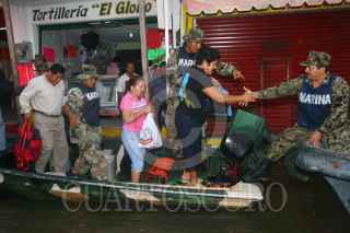 MINATITLAN, VERACRUZ., 01OCTUBRE2008.- La mayoria de las calles del centro de Minatitlan se encuentra inundadas debido a la creciente del rio Coatzacoalcos, autoridades estatales informaron que son las peores inundaciones de las que se tiene registro en los últimos 90 años. En la imagen elementos del Ejercito y la Marina ayudan a personas a llegar a sus casas que se encuentran incomunicadas debido a que tramos carreteros se encuentranb bajo el agua. FOTO: SAÚL LÓPEZ/CUARTOSCURO.COM
