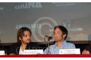 MORELIA, MICHOACÁN, 06OCTUBRE2008.- Los actores, Gael García Bernal y Diego Luna, durante la conferencia que se realizó en torno al Festival Internacional de Cine de Morelia en la que ofrecieron el programa de la gira ambulante. FOTO: FEDERICO ALTAMIRANO/CUARTOSCURO.COM