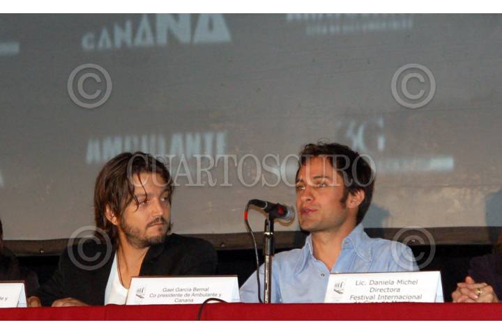 MORELIA, MICHOACÁN, 06OCTUBRE2008.- Los actores, Gael García Bernal y Diego Luna, durante la conferencia que se realizó en torno al Festival Internacional de Cine de Morelia en la que ofrecieron el programa de la gira ambulante. FOTO: FEDERICO ALTAMIRANO/CUARTOSCURO.COM