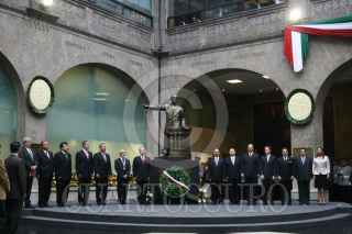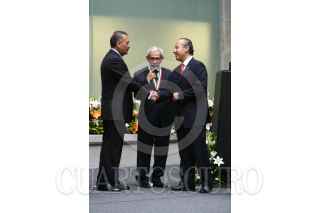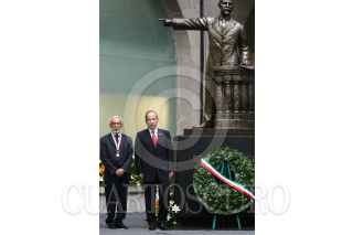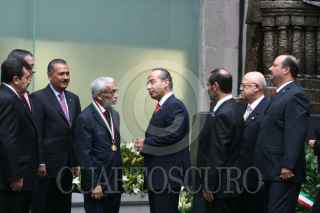 MÉXICO, D.F., 07OCTUBRE2008.- El Periodista, Miguel Ángel Granados Chapa recibio la medalla Belisario Dominguez que es el máximo reconocimiento que concede el órgano legislativo a mexicanos distinguidos por su ciencia o virtud, en grado eminente como servidores de la patria o la humanidad. En la imágen Felipe Calderon hinojosa Presidente de México conversa con el periodista en el patio central del Senado al término de la Guardia de Honor. FOTO: SÁSHENKA GUTIÉRREZ/CUARTOSCURO.COM