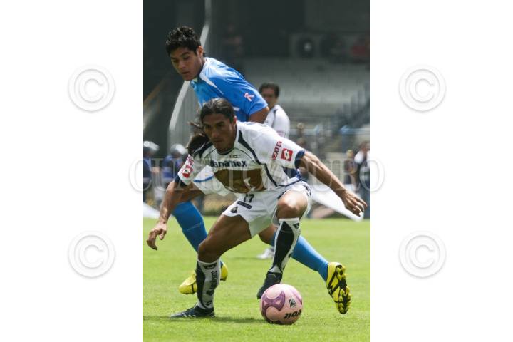 MÉXICO D.F., 12OCTUBRE2008.- Cesar Villaluz de los celestes del Cruz Azul pelea el balón con Efraín Velarde de los pumas de la UNAM durante partido de la Jornada 12 del torneo Apertura 2008 que se jugo en el Estadio Olímpico Universitario ganando Cruz Azul 2 goles a 0. FOTO: RODOLFO ANGULO/CUARTOSCURO.COM