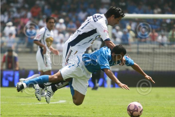MÉXICO D.F., 12OCTUBRE2008.- Cesar Villaluz de los celestes del Cruz Azul pelea el balón con Efraín Velarde de los pumas de la UNAM durante partido de la Jornada 12 del torneo Apertura 2008 que se jugo en el Estadio Olímpico Universitario ganando Cruz Azul 2 goles a 0. FOTO: RODOLFO ANGULO/CUARTOSCURO.COM