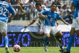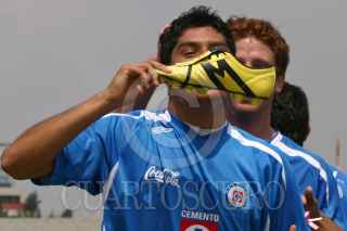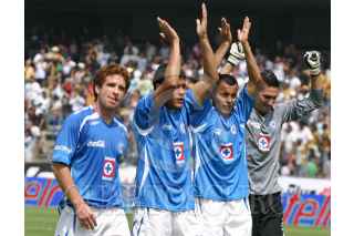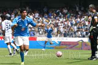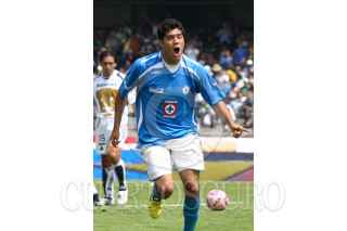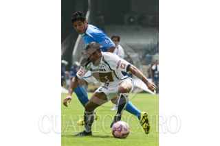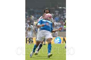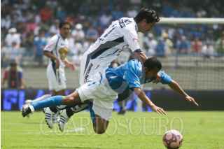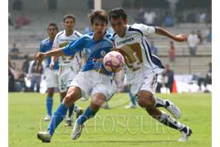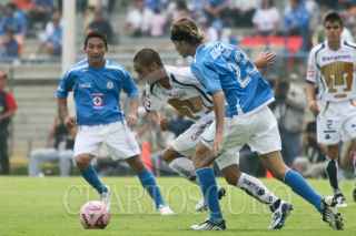 MÉXICO D.F., 12OCTUBRE2008.- Cesar Villaluz de los celestes del Cruz Azul pelea el balón con Efraín Velarde de los pumas de la UNAM durante partido de la Jornada 12 del torneo Apertura 2008 que se jugo en el Estadio Olímpico Universitario ganando Cruz Azul 2 goles a 0. FOTO: RODOLFO ANGULO/CUARTOSCURO.COM
