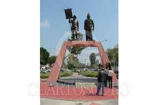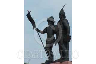 ECATEPEC, ESTADO DE MÉXICO., 12OCTUBRE2008.- Obra “Dos de… uno”, esculturas de un azteca y un español, elaborada en 2005 con motivo de la celebración del “Encuentro de Dos Mundos”, en la colonia Ciudad Azteca 1ª,su autor Víctor Gutérrez, escultor, explicó que las esculturas denotan el encuentro de dos mundos que en un día como hoy 12 de Octubre, la interpretación de su obra, es una escultura arquitectónica mesoamericana, donde un “azteca” porta en su mano una mazorca de maíz. FOTO: MARIO NULO/CUARTOSCURO.COM