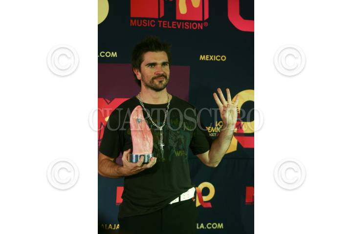 GUADALAJARA, JALISCO 16OCTUBRE2008.- El cantante Juanes muestra a los fotografos uno de los cuatro premios que gano , durante la entrega de premios MTV Latinoamerica FOTO: SÁSHENKA GUTIÉRREZ/CUARTOSCURO.COM