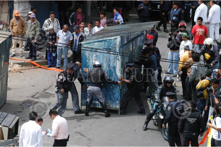 MÉXICO, D.F., 17OCTUBRE2008.- Se suscitó un enfrentamiento entre comerciantes semifijos ubicados en la calzada de Zaragoza a la altura del metro Tepalcates, el pleitó se dió entre dos bandos que se quieren apropiar del lugar dejando como resultado un mujer herida y un hombre lesionado que murió durante el traslado hacia el hospital y una camioneta destrozada y un Tsuru hacia como varios locales. FOTO: JULIETA MORACUARTOSCURO.COM