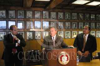 CIUDAD JUAREZ, CHIHUAHUA, 17OCTUBRE2008.- El alcalde juarense José Reyes Ferriz, acompañado del secretario del Ayuntamiento y de Comunicación Social, anuncian en conferencia de prensa la depuración de los cuerpos policiacos, por lo que fueron dados de baja 334 agentes que obtuvieron resultados negativos en las pruebas de confiabilidad aplicados por la Secretaria de Seguridad Publica Federal. FOTO: BIEN INFORMADO.COM/CUARTOSCURO.COM