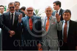 Ignacio Burgoa Origuela (centro-izquierda) y Raúl Carrancá y Rivas (centro-derecha) después de rendir su delcaración sobre el proceso penal que se sigue a los estudiantes paristas de la UNAM.