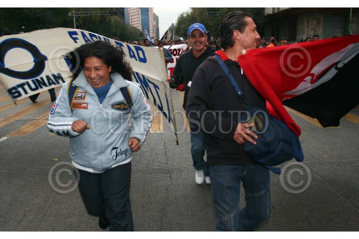 MÉXICO D.F., 28OCTUBRE2008.- Miembros del sindicato de trabajadores de la UNAM (STUNAM) marcharon encabezados por su lider Agustín Rodríguez del Monumento a la Revolucion hacia la plancha de la constitucion exigiendo el emplazamiento a huelga en solidaridad con el Sindicato Minero en solidaridad con el Sindicato Minero. FOTO: SAÚL LÓPEZ/CUARTOSCURO.COM