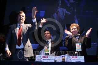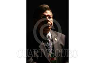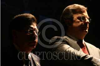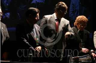 MÉXICO D.F., 31OCTUBRE2008.- Marcelo Ebrad jefe de gobierno capitalino, Enrique Hanff Vazquez presidente del comité ejecutivo del sindicato de trabajadores del Distrito federal y claudia Fatima Rosales Tobias, durante la clausura del congreso de dicha organización. FOTO: RICARDO CASTELAN/CUARTOSCURO.COM