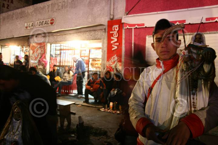 MÉXICO, D.F., 01NOVIEMBRE2008.- Miles de personas acuden hoy, Día de Todos los Santos, al populoso barrio de Tepito, en el centro de Ciudad de México, a celebrar el septimo aniversario del altar que la controvertida imagen de la Santa Muerte tiene en sus calles,para muchos, la Santa Muerte es la auténtica patrona del barrio y cada primero de mes los fieles van a rezarle un Rosario, aunque hoy, por coincidir con el aniversario, es aún más multitudinario. La niña blanca está rodeada por pequeñas “catrinas”, vestidas de mujer que representan a la muerte, y sus fieles, y en lugar de purificarse con incienso como en los tradicionales lugares de culto cristiano recurren al humo de la marihuana. FOTO: SÁSHENKA GUTIERREZ/CUARTOSCURO.COM