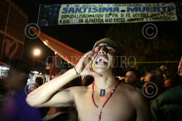 MÉXICO, D.F., 01NOVIEMBRE2008.- Miles de personas acuden hoy, Día de Todos los Santos, al populoso barrio de Tepito, en el centro de Ciudad de México, a celebrar el septimo aniversario del altar que la controvertida imagen de la Santa Muerte tiene en sus calles,para muchos, la Santa Muerte es la auténtica patrona del barrio y cada primero de mes los fieles van a rezarle un Rosario, aunque hoy, por coincidir con el aniversario, es aún más multitudinario. La niña blanca está rodeada por pequeñas “catrinas”, vestidas de mujer que representan a la muerte, y sus fieles, y en lugar de purificarse con incienso como en los tradicionales lugares de culto cristiano recurren al humo de la marihuana. FOTO: SÁSHENKA GUTIERREZ/CUARTOSCURO.COM