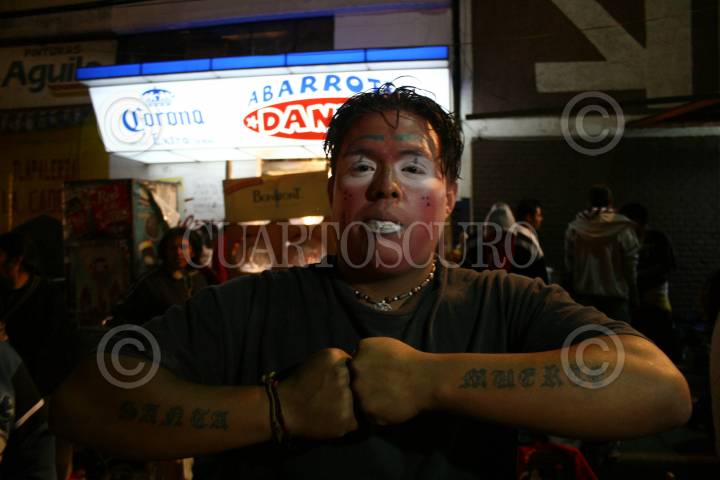 MÉXICO, D.F., 01NOVIEMBRE2008.- Miles de personas acuden hoy, Día de Todos los Santos, al populoso barrio de Tepito, en el centro de Ciudad de México, a celebrar el septimo aniversario del altar que la controvertida imagen de la Santa Muerte tiene en sus calles,para muchos, la Santa Muerte es la auténtica patrona del barrio y cada primero de mes los fieles van a rezarle un Rosario, aunque hoy, por coincidir con el aniversario, es aún más multitudinario. La niña blanca está rodeada por pequeñas “catrinas”, vestidas de mujer que representan a la muerte, y sus fieles, y en lugar de purificarse con incienso como en los tradicionales lugares de culto cristiano recurren al humo de la marihuana. FOTO: SÁSHENKA GUTIERREZ/CUARTOSCURO.COM