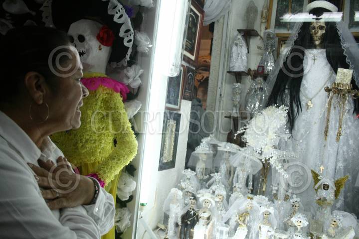 MÉXICO, D.F., 01NOVIEMBRE2008.- Miles de personas acuden hoy, Día de Todos los Santos, al populoso barrio de Tepito, en el centro de Ciudad de México, a celebrar el septimo aniversario del altar que la controvertida imagen de la Santa Muerte tiene en sus calles,para muchos, la Santa Muerte es la auténtica patrona del barrio y cada primero de mes los fieles van a rezarle un Rosario, aunque hoy, por coincidir con el aniversario, es aún más multitudinario. La niña blanca está rodeada por pequeñas “catrinas”, vestidas de mujer que representan a la muerte, y sus fieles, y en lugar de purificarse con incienso como en los tradicionales lugares de culto cristiano recurren al humo de la marihuana. FOTO: SÁSHENKA GUTIERREZ/CUARTOSCURO.COM