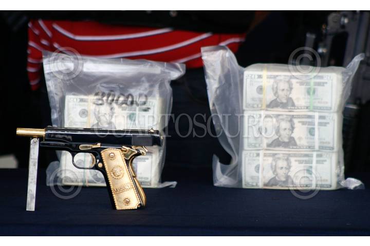MÉXICO, D.F., 07NOVIEMBRE2008.- Jaime González Durán alias "El Hummer" presunto líder y fundador de los "Zetas" fue detenido en Reynosa, Tamaulipas, por elementos de la Policía Federeral, por la tarde llegó al aeropuerto de la PFP y fue presentado a los medios de la comunicación junto con armas y dolares. FOTO: EDUARDO JIMENEZ/CUARTOSCURO.COM