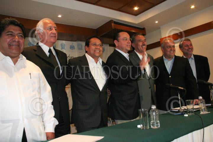 CUERNAVACA, MORELOS, 20NOVIEMBRE2008.- Héctor Ortiz Ortiz, gobernador de Tlaxcala, Marcelo de los Santo, gobernador de San Luis, Juan Manuel Oliva, gobernador de Guanajuato, Germán Martínez, dirigente nacional del PAN, Marco Antonio Adame, gobernador de la entidad, Jose Guadalupe Osuna Millán, gobernador de Baja California y Emilio Márquez, gobernador Jalisco, ofrecieron una conferencia de prensa al terminar con miras a las elecciones que se realizarán en el país el próximo año. FOTO: LUIS GIRÓN/CUARTOSCURO.COM