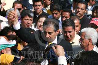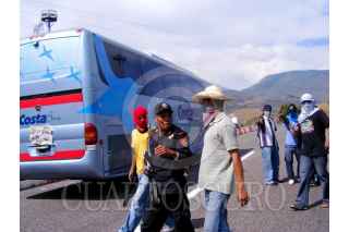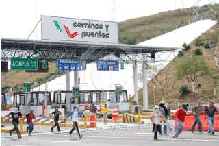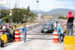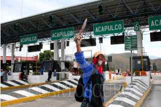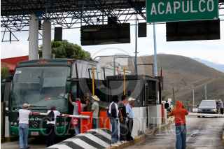 CHILPANCINGO, GUERRERO, 30NOVIEMBRE2008.- Alumnos de la normal rural de Ayotzinapa tomaron la caseta de cobro de "Palo Blanco" ubicada sobre la Autopista del Sol por varias horas, para recordar el desalojo violento que sufrieran hace un año por parte de elementos de la Policía Federal Preventiva (PFP) cuando se manifestaban en la caseta de cobro de "La Venta" para exigir plazas para los egresados; de la misma manera protestaron para exigir la destitución del secretario de educación José Luis Gonzalez de la Vega Otero, respeto a la licenciatura de Educación Primaria y contra el examen de oposición que pretende aplicarles la SEG para el otorgamiento de plazas para maestros. Cabe mencionar que durante la protesta un elemento de la policía auxiliar (quienes se encargan de resguardar las casetas) amenazo a los estudiantes normalistas de Ayotzinapa cortando cartucho a su arma de fuego que tiene a cargo. FOTO: OSCAR ALVARADO/CUARTOSCURO.COM