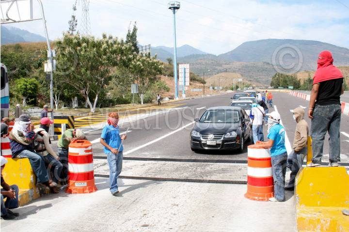 CHILPANCINGO, GUERRERO, 30NOVIEMBRE2008.- Alumnos de la normal rural de Ayotzinapa tomaron la caseta de cobro de "Palo Blanco" ubicada sobre la Autopista del Sol por varias horas, para recordar el desalojo violento que sufrieran hace un año por parte de elementos de la Policía Federal Preventiva (PFP) cuando se manifestaban en la caseta de cobro de "La Venta" para exigir plazas para los egresados; de la misma manera protestaron para exigir la destitución del secretario de educación José Luis Gonzalez de la Vega Otero, respeto a la licenciatura de Educación Primaria y contra el examen de oposición que pretende aplicarles la SEG para el otorgamiento de plazas para maestros. Cabe mencionar que durante la protesta un elemento de la policía auxiliar (quienes se encargan de resguardar las casetas) amenazo a los estudiantes normalistas de Ayotzinapa cortando cartucho a su arma de fuego que tiene a cargo. FOTO: OSCAR ALVARADO/CUARTOSCURO.COM