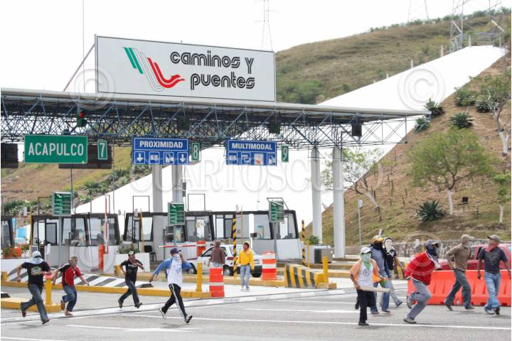 CHILPANCINGO, GUERRERO, 30NOVIEMBRE2008.- Alumnos de la normal rural de Ayotzinapa tomaron la caseta de cobro de "Palo Blanco" ubicada sobre la Autopista del Sol por varias horas, para recordar el desalojo violento que sufrieran hace un año por parte de elementos de la Policía Federal Preventiva (PFP) cuando se manifestaban en la caseta de cobro de "La Venta" para exigir plazas para los egresados; de la misma manera protestaron para exigir la destitución del secretario de educación José Luis Gonzalez de la Vega Otero, respeto a la licenciatura de Educación Primaria y contra el examen de oposición que pretende aplicarles la SEG para el otorgamiento de plazas para maestros. Cabe mencionar que durante la protesta un elemento de la policía auxiliar (quienes se encargan de resguardar las casetas) amenazo a los estudiantes normalistas de Ayotzinapa cortando cartucho a su arma de fuego que tiene a cargo. FOTO: OSCAR ALVARADO/CUARTOSCURO.COM