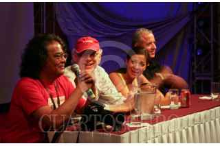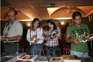 VERACRUZ, VERACRUZ, 29NOVIEMBRE2008.- Continua el Tour de la Luz de David Eisenberg, en el puerto jarocho, que este domingo termina con su gira por este estado, compartiendo conociemientos de fotografos reconocidos en el ambito fotoperiodistico y fotografía de moda, entre estos fotografos se encuentra David Eisenberg y Pedro Valtierra. El Tour tiene como objeto, de desarrollar mas los conociemientos entre estudiantes y no estudiantes para así poder ponerlo en practica. En la imágen, el fotografo Pedro Valtierra, David Eisenberg, la Play-Mate, Julia Orellen y el director de la fototeca del estado de Veracruz, Carlos Cano. FOTO: MISAEL VALTIERRA/CUARTOSCURO.COM