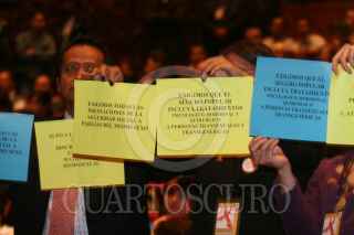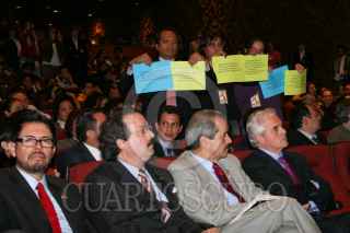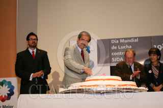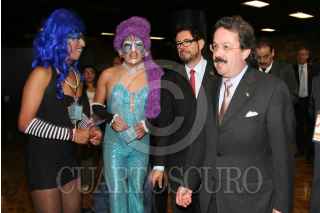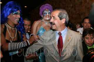 MÉXICO D.F., 01DICIEMBRE2008.- José Ángel Córdova Villalobos titular de la Secretaría de Salud, acudió esta mañana al Museo Nacional de Antropología, donde se llevo acabo la celebración del 20 Aniversario de la creación de CONASIDA, esto en el Día Mundial de la Lucha Contra el SIDA. En la imagen el secretario es saludado por un par de drag queens. FOTO: GUILLERMO PEREA/CUARTOSCURO.COM
