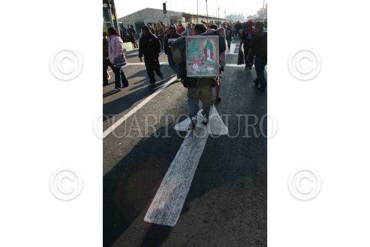 MÉXICO, D.F., 11DICIEMBRE2008.- Continuan llegando miles de peregrinos a la Basílica de Guadalupe, algunos duermen a las faldas de esta, otros tantos recorren las calles con imágenes gigantes, danzantes bailan al ritmo de su musica tradicional para entretener a los peregrinos, pero todos están reunidos en este lugar para cantarle las mañanitas virgen morena FOTO: RICARDO CASTELAN/CUARTOSCURO.COM