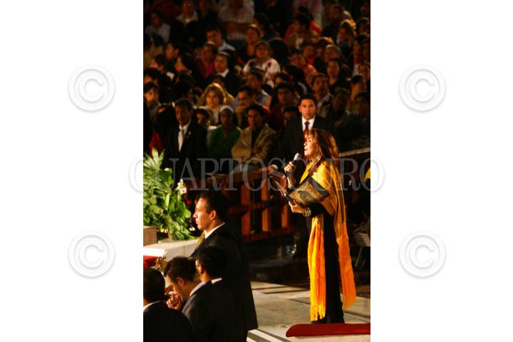 MÉXICO, D.F., 12DICIEMBRE2008.- Cientos de miles de personas abarrotaron las calles aledañas, el atrio y la Basílica de Guadalupe para cantarle las mañanitas a la Virgen de Guadalupe. Al filo de la media noche el rector de la basílica Diego Monroy encabezó las celebraciones del 477 aniversario de la aparición de la Virgen del Tepeyac. FOTO: SAÚL LÓPEZ/CUARTOSCURO.COM