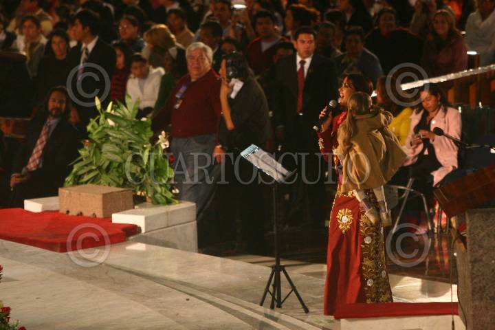 MÉXICO, D.F., 12DICIEMBRE2008.- Cientos de miles de personas abarrotaron las calles aledañas, el atrio y la Basílica de Guadalupe para cantarle las mañanitas a la Virgen de Guadalupe. Al filo de la media noche el rector de la basílica Diego Monroy encabezó las celebraciones del 477 aniversario de la aparición de la Virgen del Tepeyac. FOTO: SAÚL LÓPEZ/CUARTOSCURO.COM