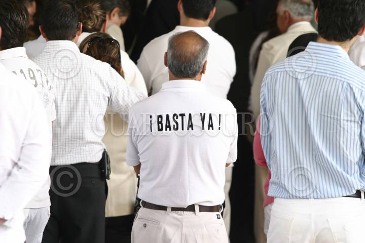 MÉXICO, D.F., 13DICIEMBRE2008.- Un asistente a la misa de despedida en memoria de Silvia Vargas Escalera, hija del ex titular de la Comisión Nacional del Deporte Nelson Vargas y Silvia Escalera, porta una camisa con la leyenda: "¡Basta Ya!". FOTO: RODOLFO ANGULO/CUARTOSCURO.COM
