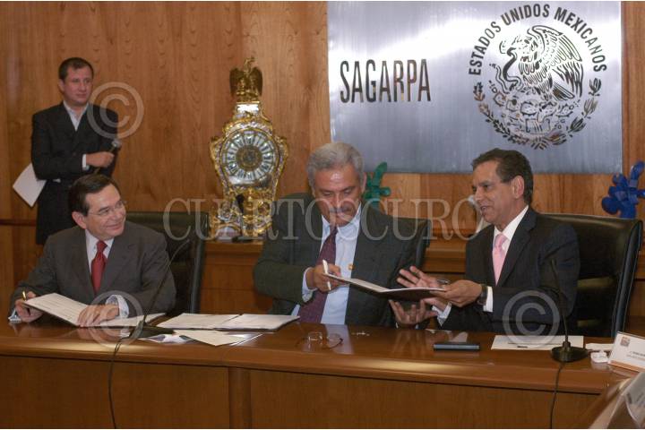 MÉXICO D.F., 30DICIEMBRE2008.- Juan Carlos Hurtado, gobernador de Campeche, Alberto Cárdenas, Secretario de Agricultura y Fidel Herrera Beltrán, gobernador de Veracruz, firmaron un convenio en materia del campo en la sede de la SAGARPA. FOTO: IVÁN MENDEZ/CUARTOSCURO.COM