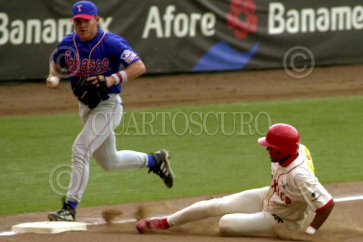Gonzálo Meza de los Diablos de México roba segunda base, pero los Olmecas de Tabasco logran obtener un Doble play para cerrar la septima entrada, en el Foro Sol. FOTO: David Bolaños/CUARTOSCURO.COM